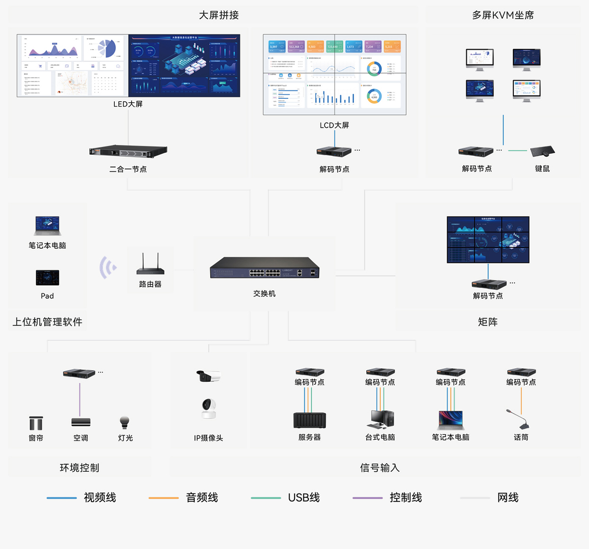不需要依賴管理服務器,系統(tǒng)由編碼、解碼節(jié)點組成,集拼接、矩陣、坐席功能為一體。