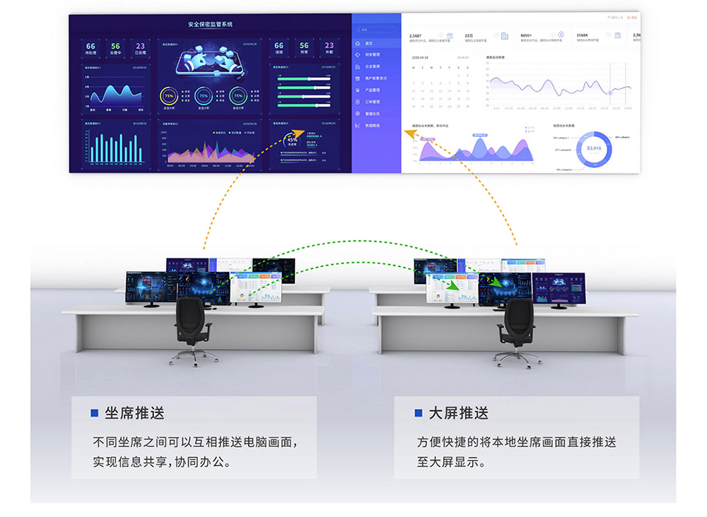 坐席有多臺顯示器時,每個顯示器可以自由選擇顯示不同的主機畫面,操作人員通過一套鍵鼠即可控制多臺主機,自由劃屏。