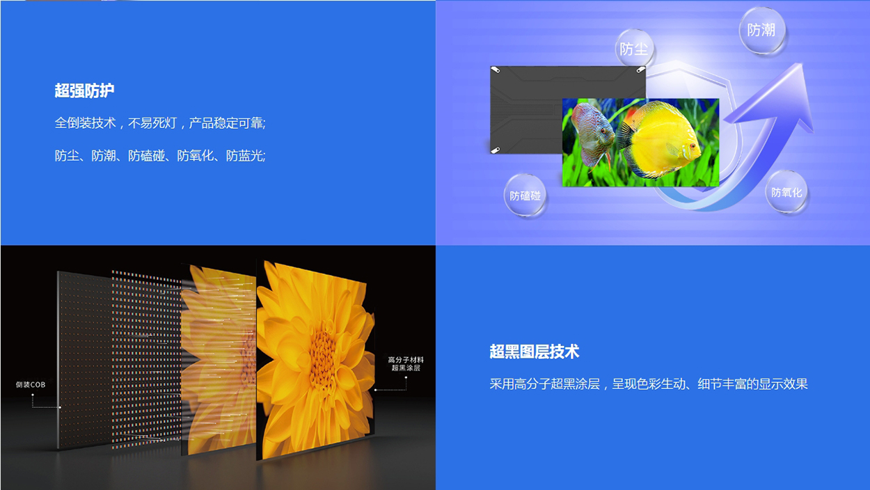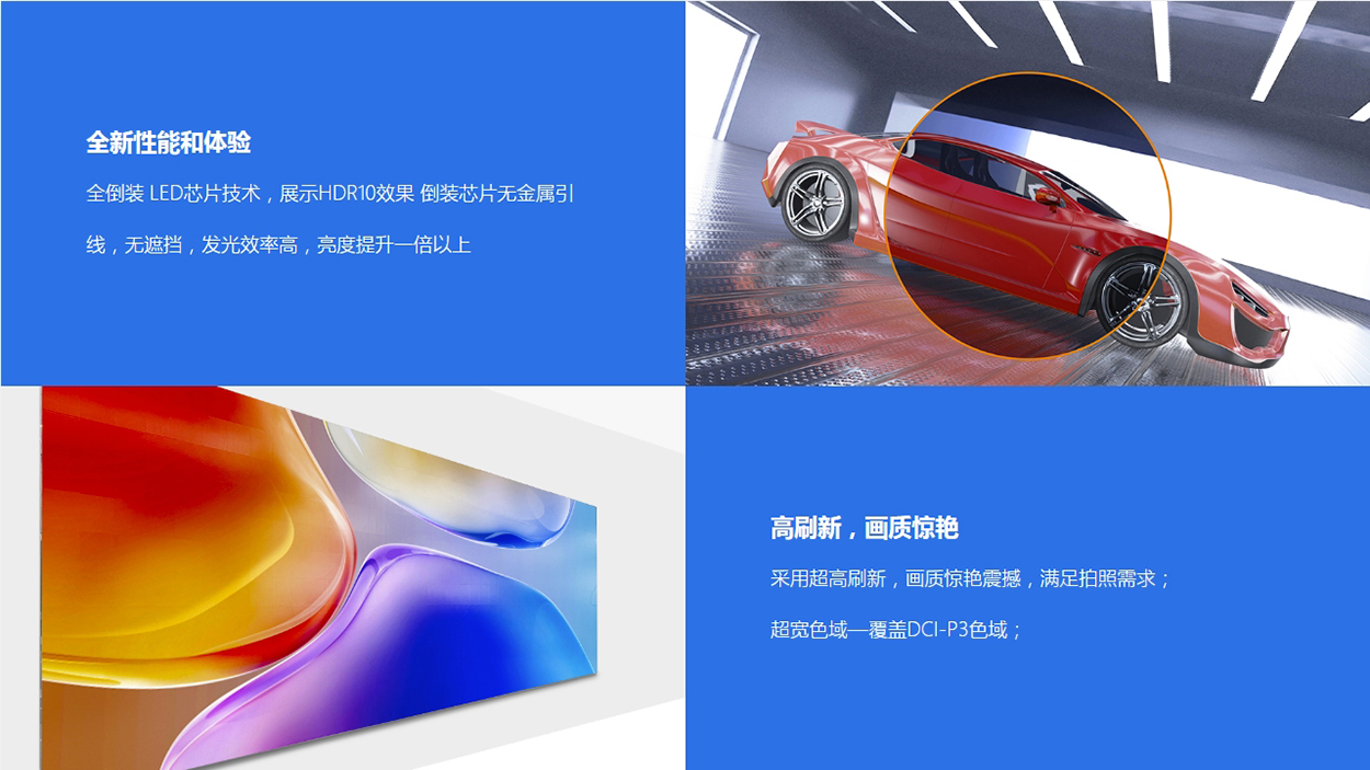 突破感官新紀(jì)元,搭載倒裝COB封裝技術(shù),打造出具有黑、靚、冷、強(qiáng)特質(zhì)的新一代LED超高清巨幕 LED類(lèi)型:倒裝RGB