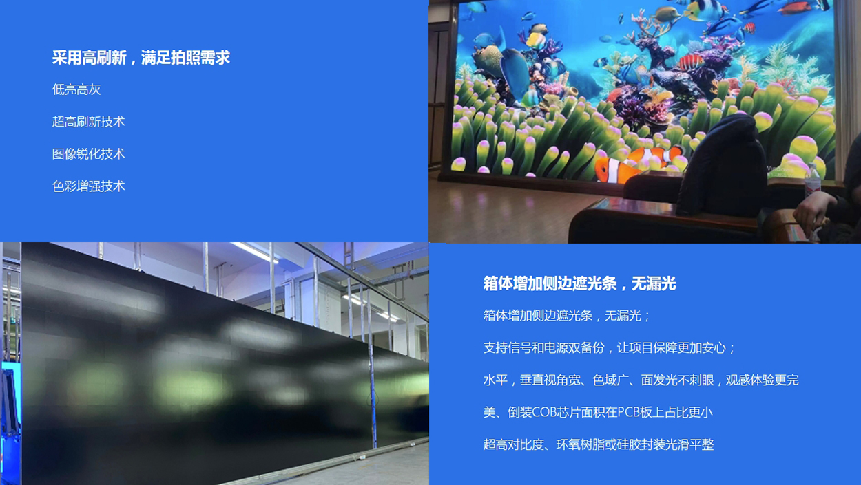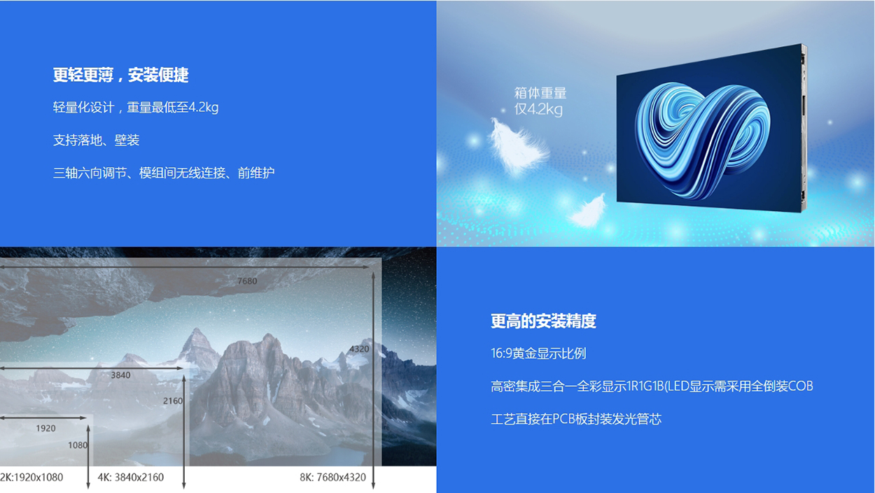 采用新的“澄翼-II”箱體,厚度只有 28mm,整屏厚度也只有 31mm,整體更加輕薄,另外升級了更加簡便和精準(zhǔn)的安裝方式,在提高精度的同時也簡化了運(yùn)輸和安裝的復(fù)雜度,水平,垂直視角寬、色域廣、面發(fā)光不刺眼,觀感體驗(yàn)更完美、倒裝COB芯片面積在PCB板上占比更小, 高對比度、環(huán)氧樹脂或硅膠封裝光滑平整,成像距離短, 銳度高,畫面柔和、顯示效果更佳。